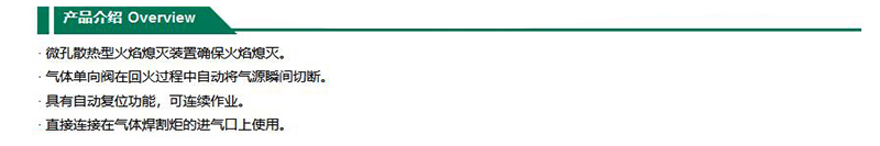·微孔散热型火焰熄灭装置确保火焰熄灭 ·气体单向阀在回火过程中自动将气源瞬间切断 ·具有自动复位功能,可连续作业。 ·直接连接在气体焊割炬的进气口上使用