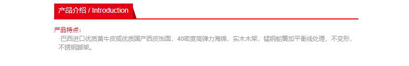 ·巴西进口优质黄牛皮或优质国产西皮饰面,40密度高弹力海绵,实木木架,锰钢蛇簧加平衡线处理,不变形,不锈钢脚架。