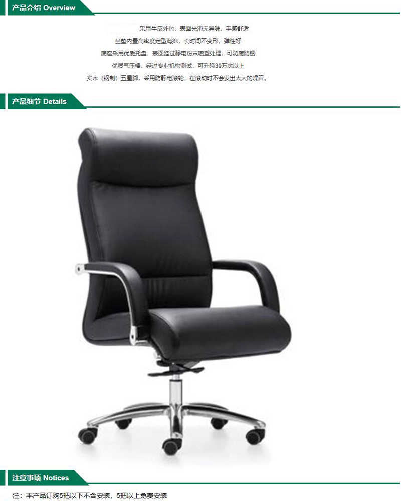 ·采用牛皮外包,表面光滑无异味,手感舒适 ·坐垫内置高密度定型海绵,长时间不变形,弹性好 ·底座采用优质托盘,表面经过静电粉末喷塑处理,可防腐防锈 ·优质气压棒,经过专业机构测试,可升降30万次以上 ·实木(钢制)五星脚,采用防静电滚轮,在滚动时不会发出太大的噪音。