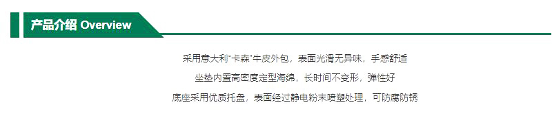 ·采用意大利牛皮外包,表面光滑无异味,手感舒适 ·坐垫内置高密度定型海绵,长时间不变形,弹性好 ·底座采用优质托盘,表面经过静电粉末喷塑处理,可防腐防锈