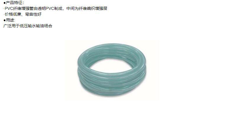 ·PVC纤维增强管由透明PVC制成,中间为纤维编织增强层 ·价格低廉、弯曲性好