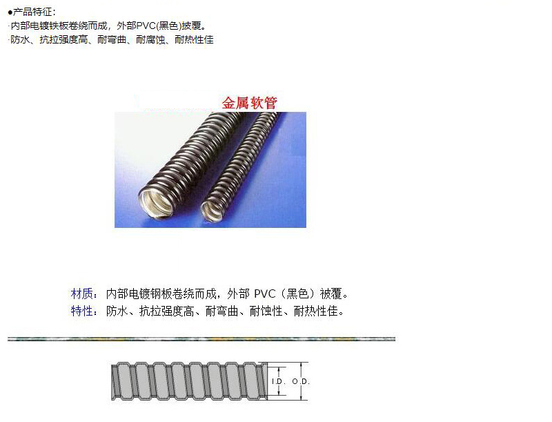 ·内部电镀铁板卷绕而成,外部PVC(黑色)披覆。 ·防水、抗拉强度高、耐弯曲、耐腐蚀、耐热性佳
