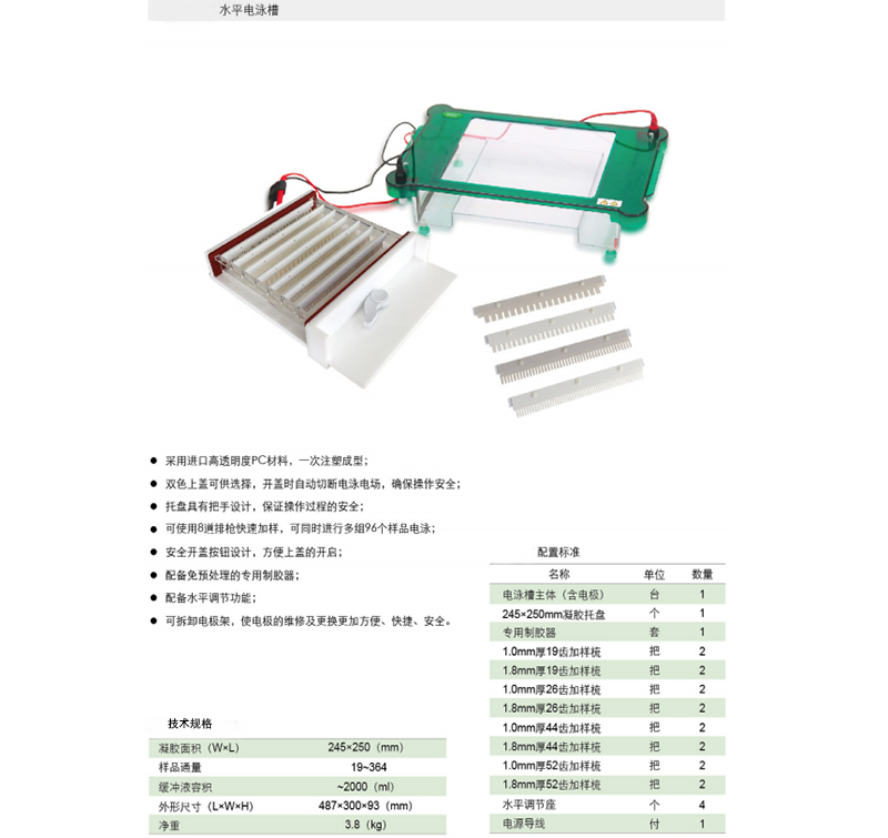 ·采用进口高透明度PC材料,一次注塑成型; ·双色上盖可供选择,开盖时自动切断电泳电场,确保操作安全;托盘具有把手设计,保证操作过程的安全; ·可使用8道排枪快速加样,可同时进行多组96个样品电泳;安全开盖按钮设计,方便上盖的开启; ·配备免预处理的专用制胶器; ·配备水平调节功能; ·可拆卸电极架,使电极的维修及更换更加方便、快捷、安全。