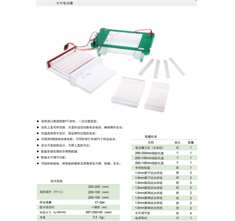 ·采用进口高透明度PC材料,一次注塑成型; ·双色上盖可供选择,开盖时自动切断电泳电场,确保操作安全; ·托盘具有把手设计,保证操作过程的安全; ·可使用8道排枪快速加样,可同时进行多组96个样品电泳;安全开盖按钮设计,方便上盖的开启; ·配备免预处理的专用制胶器; ·配备水平调节功能; ·可拆卸电极架,使电极的维修及更换更加方便、快捷、安全。