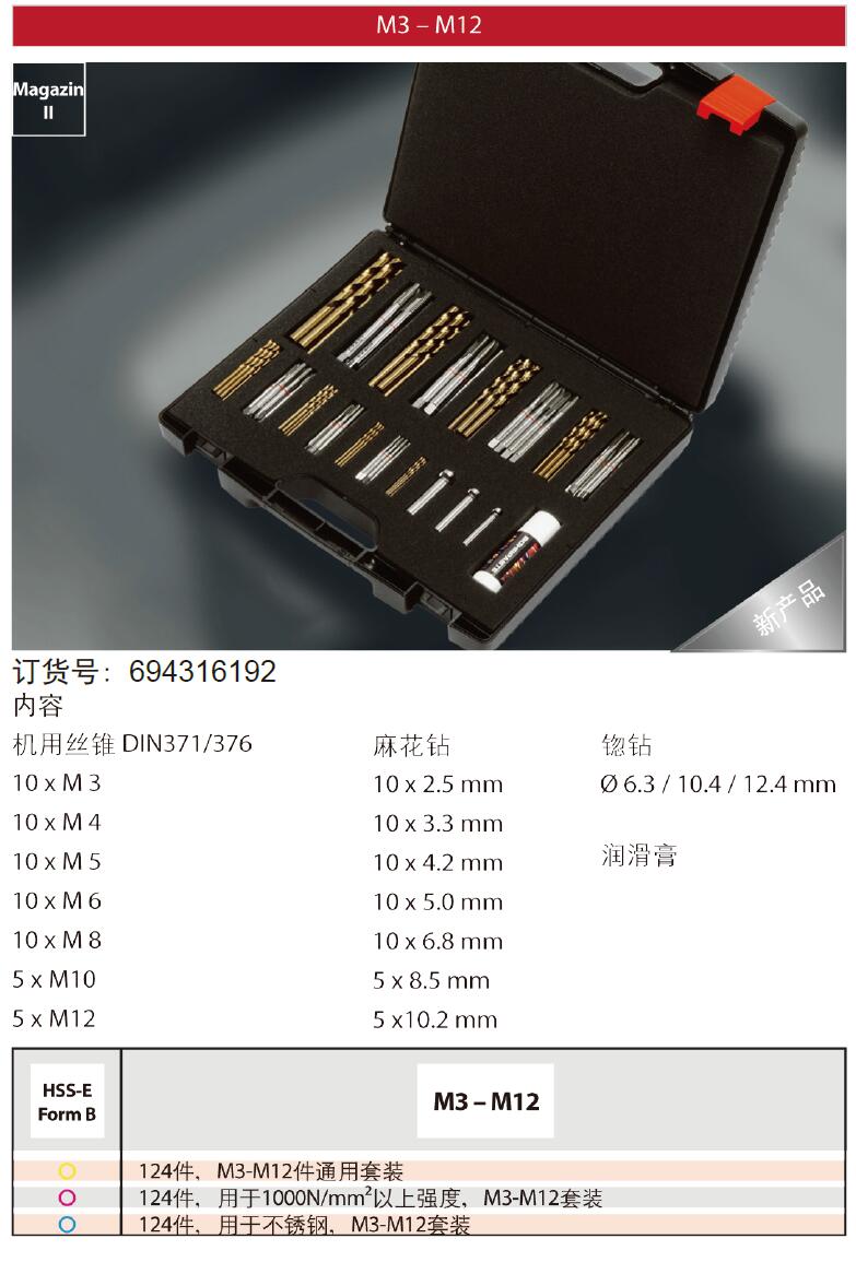 D23643 694316192 机用丝锥DIN371/376:10*M3/10*M4/10*M5/10*M6/10*M8/5*M10/5*M12 麻花钻:10*2.5mm/10*3.3mm/10*4.2mm/10*5.0mm/10*6.8mm/5*8.5mm/5*10.2mm 锪钻:Φ6.3/10.4/12.4mm 润滑膏 124 HSS-E Form B 12552.00