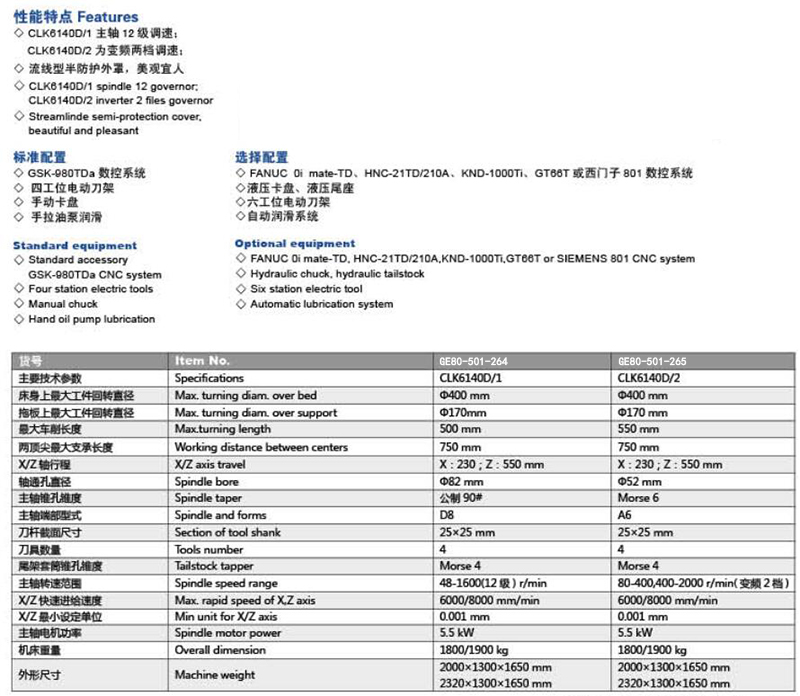 配置GSK-980TDa数控系统;四工位电动刀架;手动卡盘;手拉油泵润滑