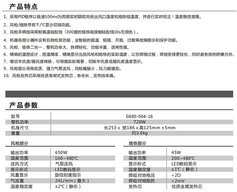·采用PID程序以极速100ms为周期实时跟踪风枪出风口温度和烙铁咀温度,并进行实时校正!温度稳定度高。 ·风枪/烙铁带有F/C显示切换功能。 ·风枪手柄线采用耐高温硅胶线〔300度的烙铁咀接触硅胶线30s无损伤)。 ·机器各部分器件设有自我检测功能,全智能的超温、短路、开路、过载等故暲提示和保护功能。 ·风枪、烙铁二合一,整机功率大、拆焊轻松、功能丰富、适用性强。 ·精确的温控设计,控温精准,精确显示当前风枪和烙铁的实际温度,让您焊接过程,焊接变得更轻松,同时避免损伤娇嫩元件。 ·增设华氏度/摄氏度转换