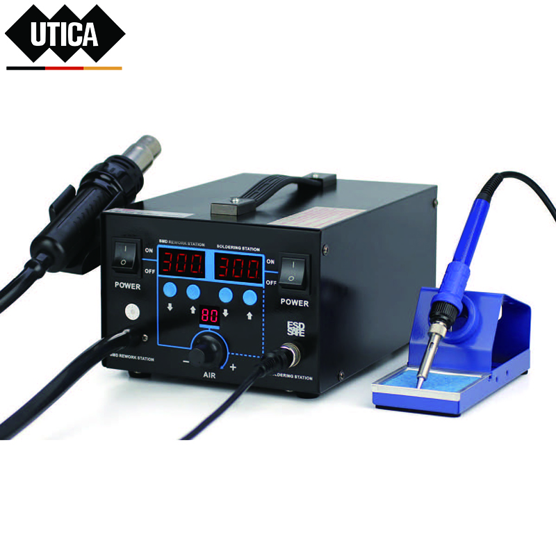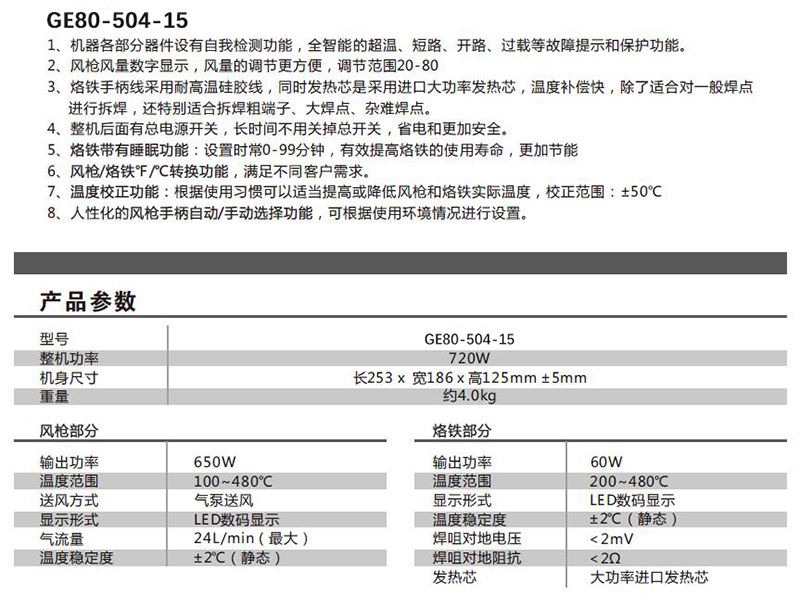 ·机器各部分器件设有自我检测功能,全智能的超温、短路、开路、过载等故障提示和保护功能。 ·风枪风量数字显示,风量的调节更方便,调节范围20-80 ·烙铁手柄线采用耐高温硅胶线,同时发热芯是采用进口大功率发热芯,温度补偿快,除了适合对一般焊点 进行拆焊,还特别适合拆焊粗端子、大焊点、杂难焊点。 ·整机后面有总电源开关,长时间不用关掉总开关,省电和更加安全。 ·烙铁带有睡眠功能︰设置时常0-99分钟,有效提高烙铁的使用寿命,更加节能 ·风枪/烙铁°F/C转换功能,满足不同客户需求。 ·温度校正功能∶根据使用习