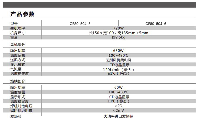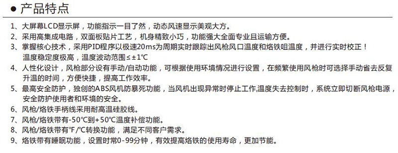 ·大屏幕LCD显示屏,功能指示一目了然,动态风速显示美观大方。 ·采用高集成电路,双面板贴片工艺,机身精致小巧,功能强大全面专业且运输方便。 ·掌握核心技术,采用PID程序以极速20ms为周期实时跟踪出风枪风口温度和烙铁咀温度,并进行实时校正! 温度稳定度极高,温度波动范围≤±1C ·人性化设计,风枪部分设有手动/自动功能,可根据使用环境情况进行设置,在频繁使用风枪时可选择手动省去反复升温的时间,方便快捷,提高工作效率。 ·最高安全防护,独创的ABS风机防暴死功能,当风机出现异常时停止工作温度失去控制时,