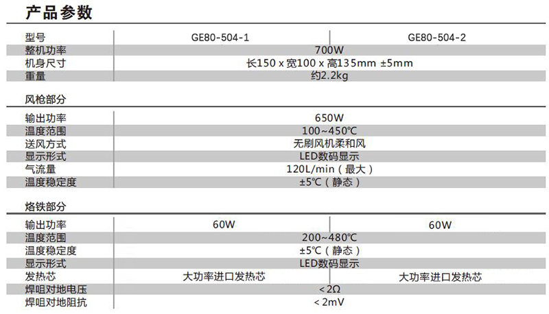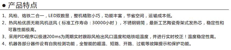 ·风枪、烙铁二合一,LED双数显,整机精致小巧,功能丰富,节省空间,运输成本低。