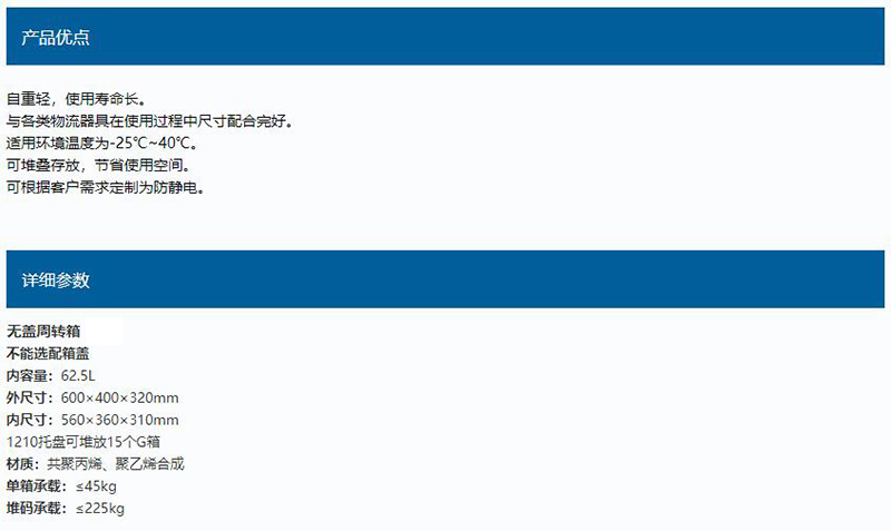 ·材质为共聚丙烯、聚乙烯合成 ·自重轻,使用寿命长 ·与各类物流器具在使用过程中尺寸配合完好 ·适用环境温度为-25℃~40℃ ·可堆叠存放,节省使用空间 ·可根据客户需求定制为防静电