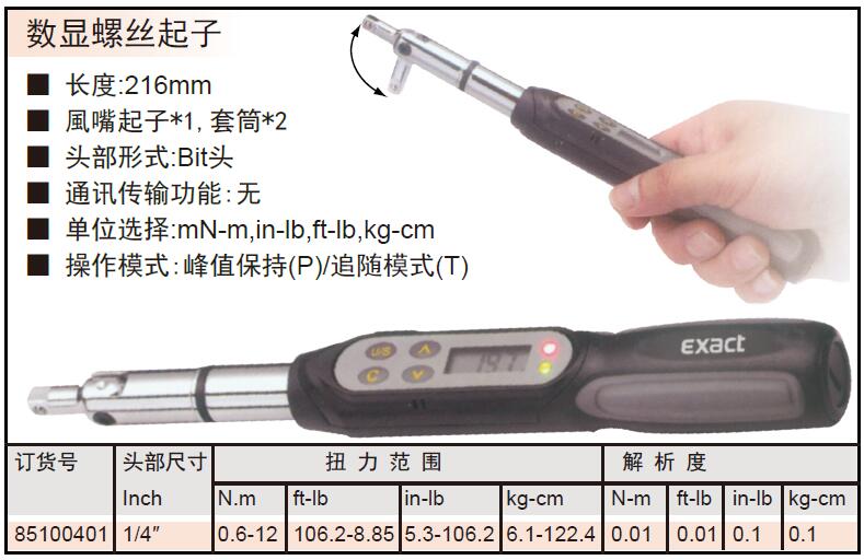 ·长度:216mm ·风嘴起子*1,套筒*2 ·头部形式:Bit头·单位选择:mN-m,in-lb,ft-lb,kg-cm ·操作模式:峰值保持(P)/追随模式(T)