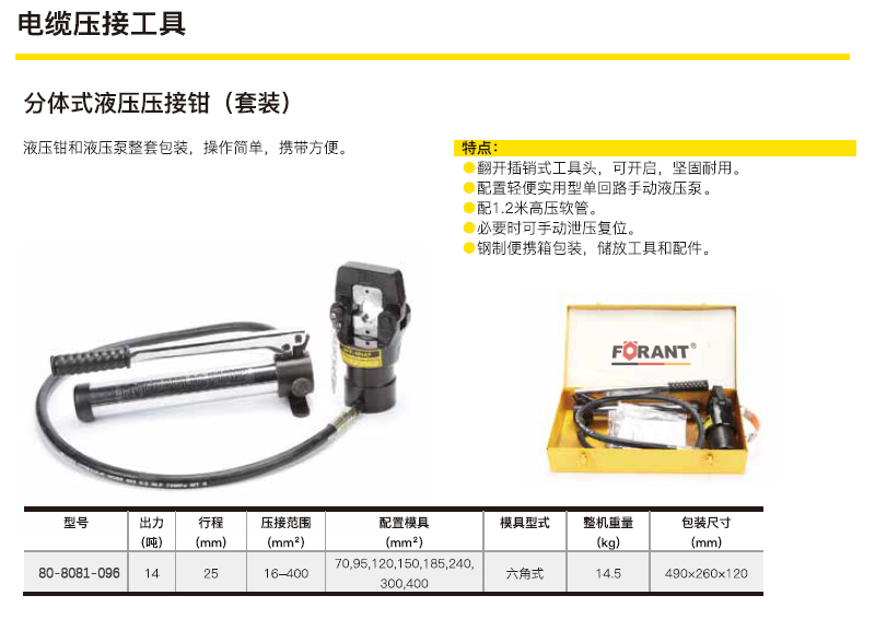 ·翻开插销式工具头,可开启,坚固耐用。 ·配置轻便实用型单回路手动液压泵HHB- -600A。 ·配1·2米高压软管。 ·必要时可手动泄压复位。 ·钢制便携箱包装,储放工具和配件。