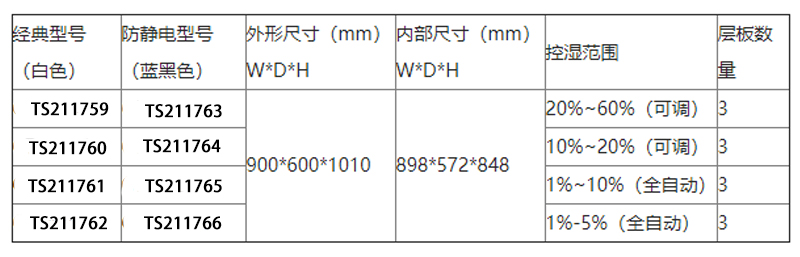 规格:  防静电型容积435L控制范围(RH)10%~20%(可调) 制造商型号:  TS211764