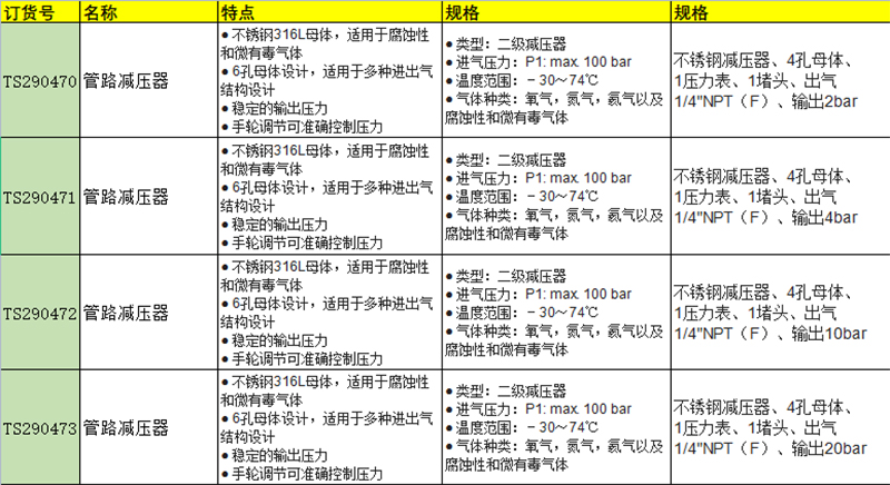 不锈钢减压器、4孔母体、1压力表、1堵头、出气1/4"NPT(F)、输出2bar