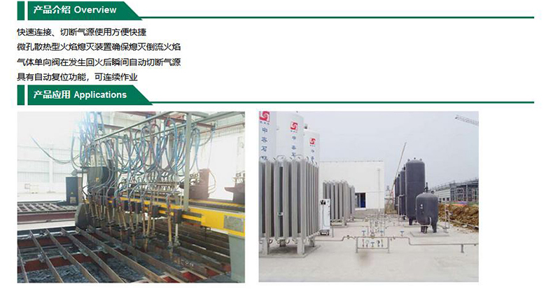 ·快速连接、切断气源使用方便快捷 ·微孔散热型火焰熄灭装置确保熄灭倒流火焰 ·气体单向阀在发生回火后瞬间自动切断气源 ·具有自动复位功能,可连续作业