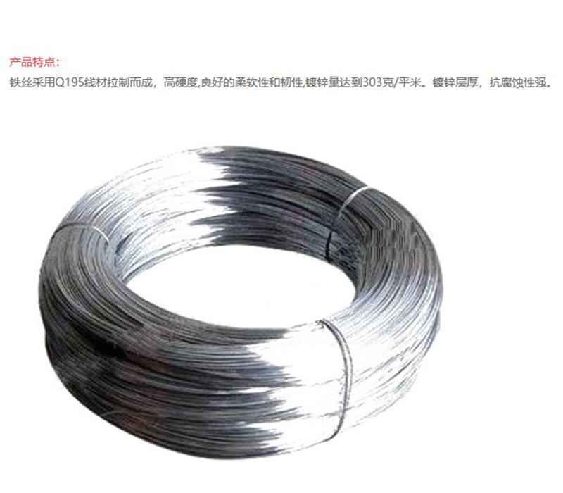 ·铁丝采用Q195线材拉制而成,高硬度,良好的柔软性和韧性,镀锌量达到303克/平米,镀锌层厚,抗腐蚀性强