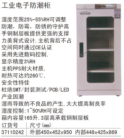 湿而导致的不良品的产生,大大提高制良率湿度控制:1~50%RH可设定箱内容量165升,3层高承载钢制层板