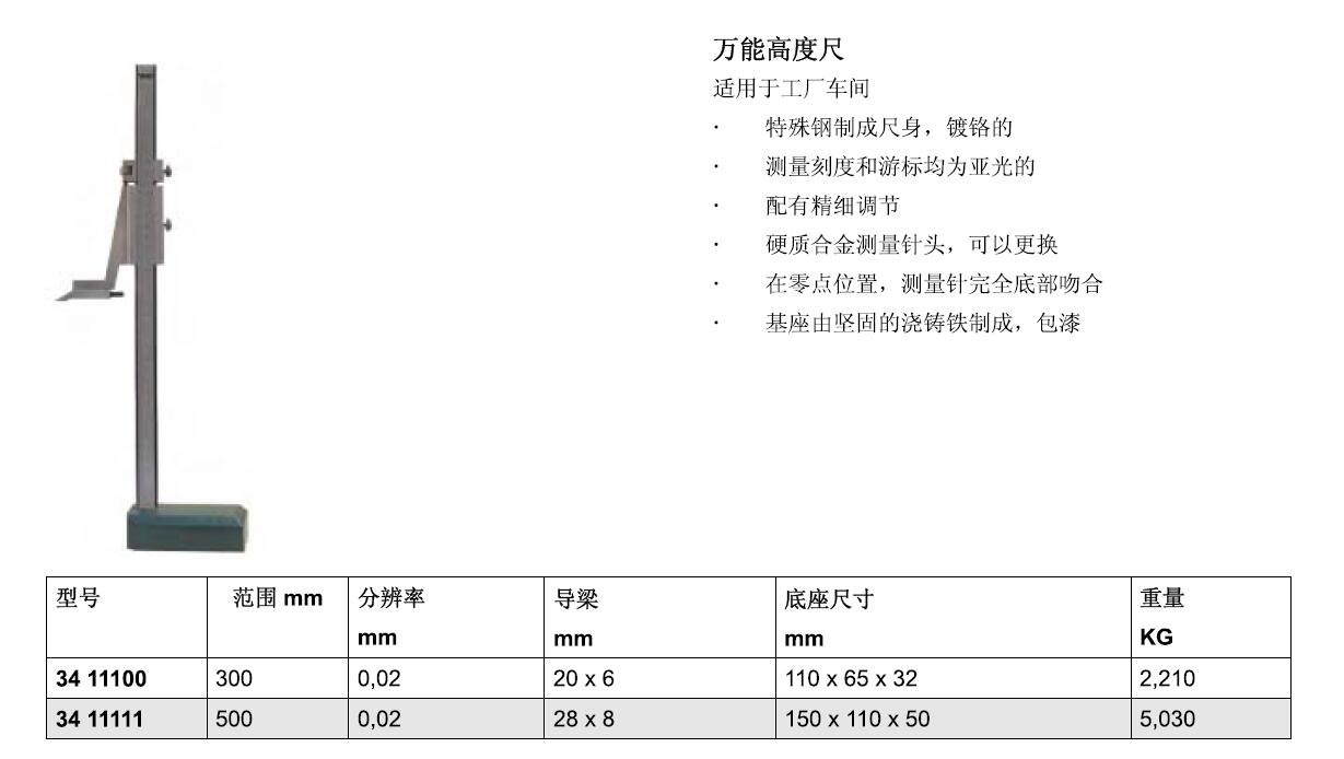 ·特殊钢制成尺身. 锁铭的 ·测量刻度和游标均为亚光的 ·配有精细调节 ·硬质合金测措针头. 可以更换 ·在零点位置. 测量针完全底部吻合基座由坚固的浇铸铁制成. 包漆