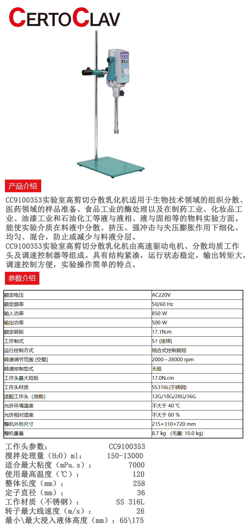 ·采用结构紧凑的串激式微型高速电机驱动,适用于实验室低至中、高粘度液体的搅拌混合;在液体介质中分散均质颗粒物料、组织细胞破碎等。