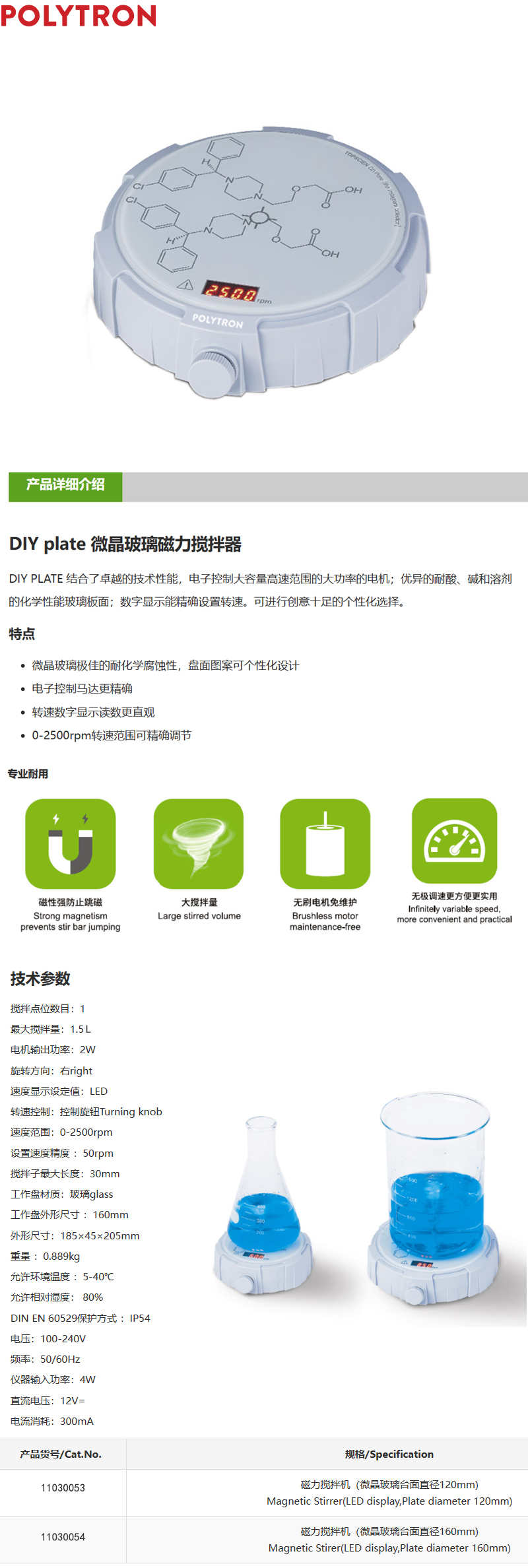 ·微晶玻璃极佳的耐化学腐蚀性,盘面图案可个性化设计; ·电子控制马达更精确; ·转速数字显示读数更直观; ·0-2500rpm转速范围可精确调节。