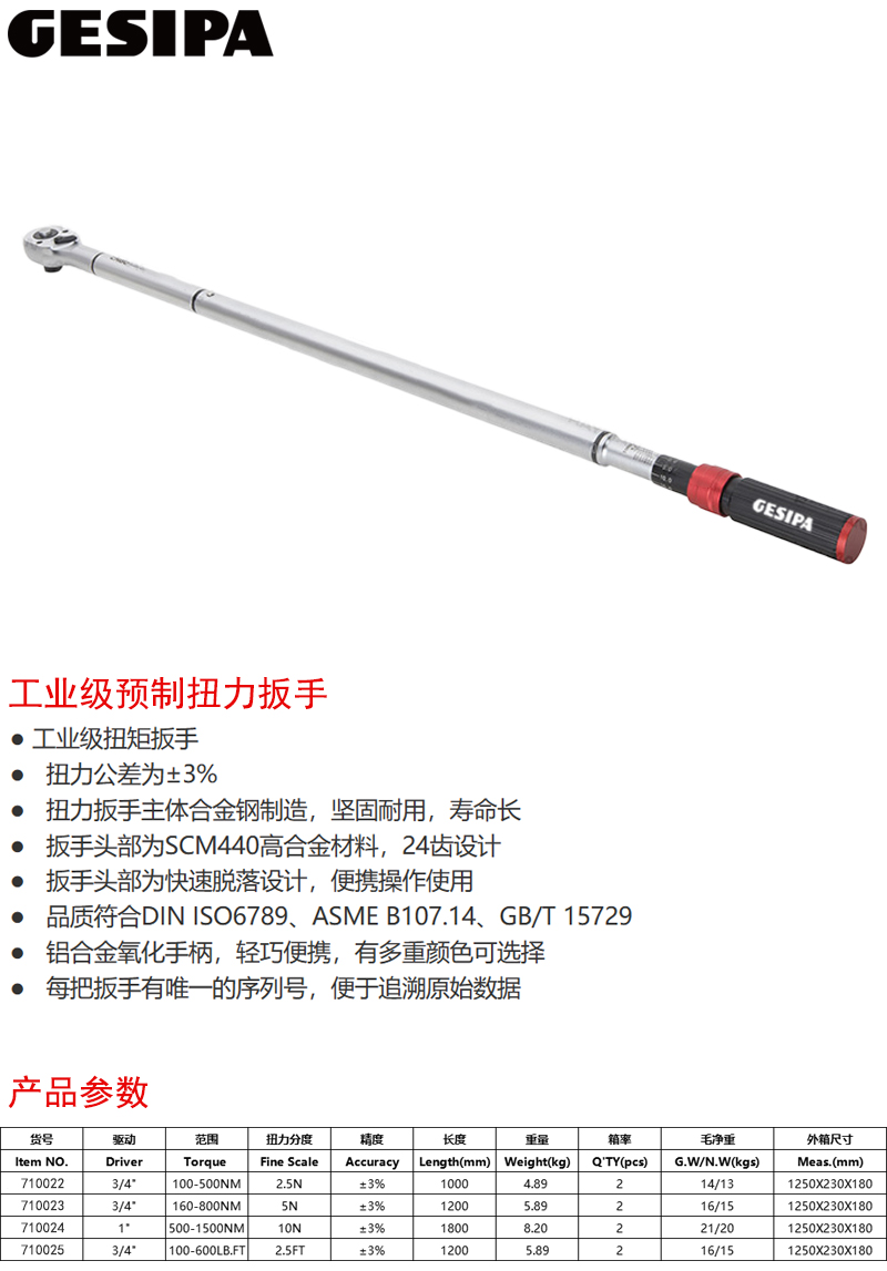 ·工业级扭矩扳手; ·扭力扳手主体合金钢制造,坚固耐用,寿命长; ·扳手头部为SCM440高合金材料,24齿设计; ·扳手头部为快速脱落设计,便携操作使用; ·品质符合DIN IS06789、ASME B107.14、GB/T15729 ·铝合金氧化手柄,轻巧便携,有多重颜色可选择; ·每把扳手有唯一的序列号,便于追溯原始数据。