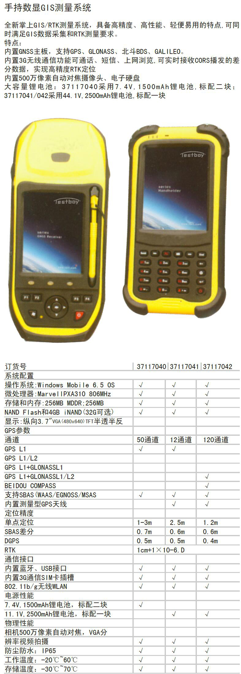 A52439 37117040 大容量锂电池: 3 7 1 1 7 0 4 0 采用7 . 4 V , 1 5 0 0 m A h 锂电池, 标配二块; Windows Mobile 6.5 OS MarvellPXA310 806MHz 256MB MDDR;256MB 纵向3.7"VGA(480×640)TFT半透半反 50通道 1-3m 0.7m 0.5m 1cm+1×10-6.D IP65 -20℃~60℃ -30℃~70℃ 7.4V,1500mAh锂电池,标配二块 相机500万像素自动对焦,VGA分辨率视频拍摄 2925.00