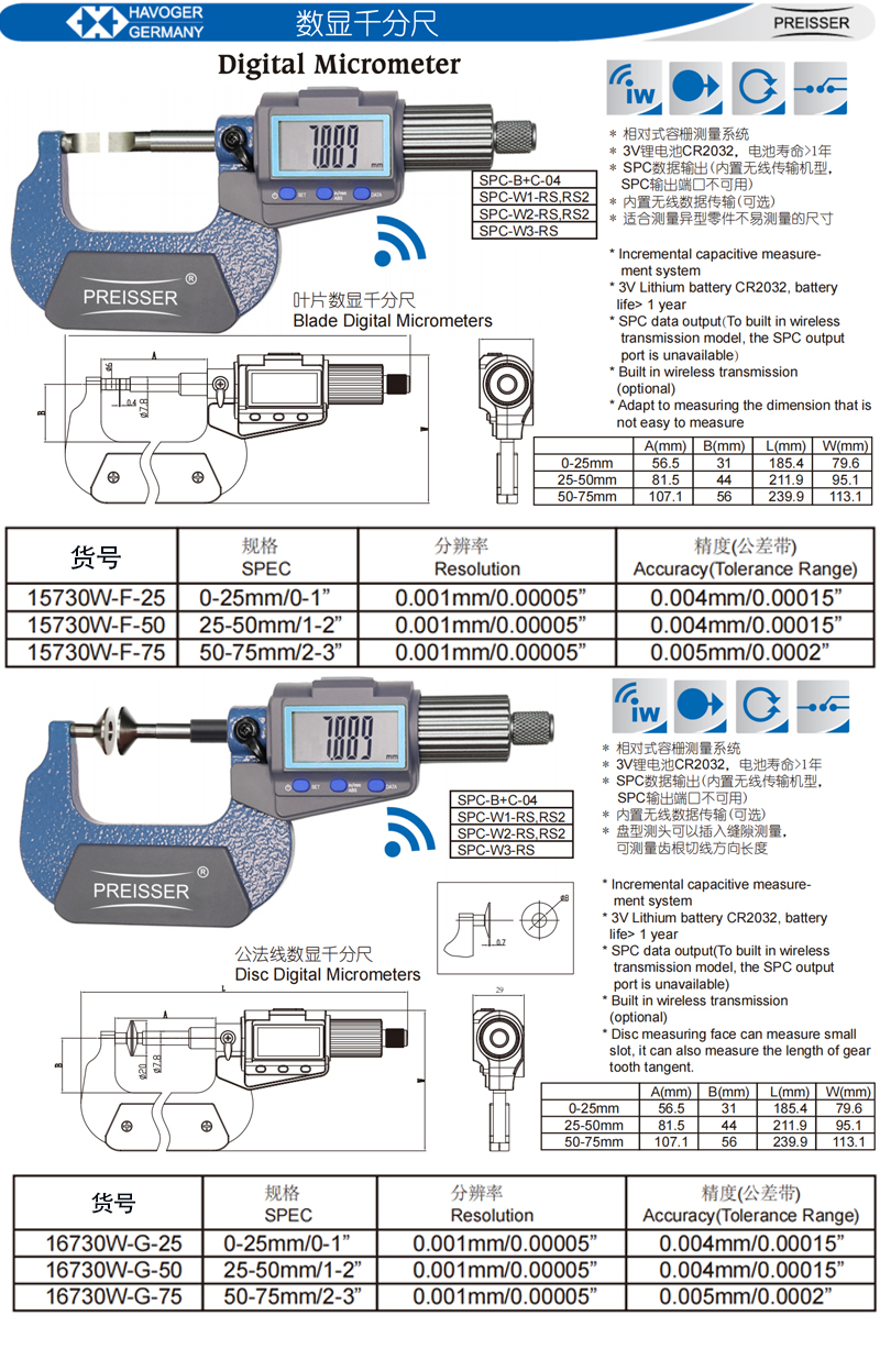 * 相对式容栅测量系统* 3V锂电池CR2032,电池寿命>1年* SPC数据输出(内置无线传输机型,SPC输出端口不可用)* 内置无线数据传输(可选)* 盘型测头可以插入缝隙测量,可测量齿根切线方向长度