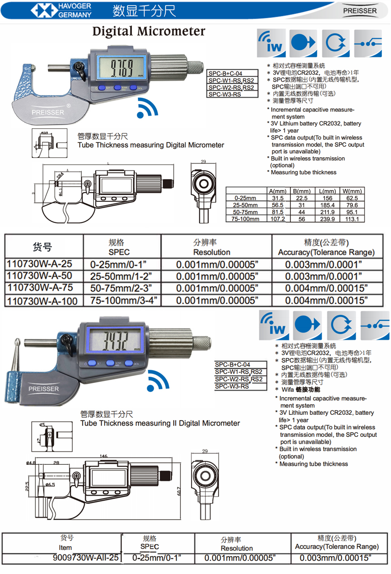 * 相对式容栅测量系统* 3V锂电池CR2032,电池寿命>1年* SPC数据输出(内置无线传输机型,SPC输出端口不可用)* 内置无线数据传输(可选)* 测量管厚等尺寸* Wifa链接功能