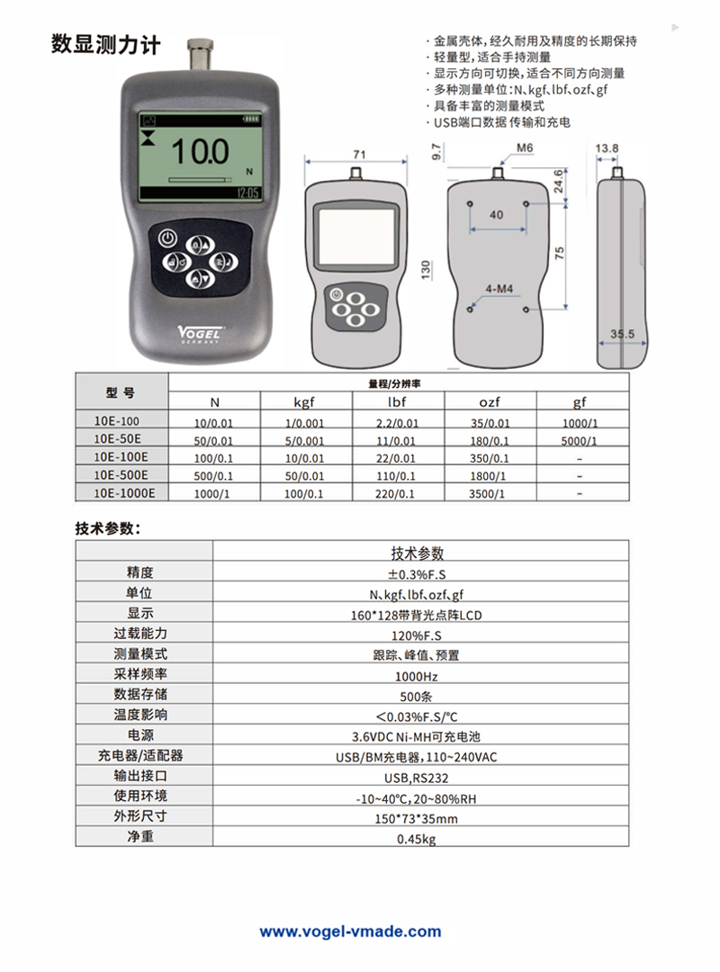 .金属壳体,经久耐用及精度的长期保持.轻量型,适合手持测量.显示方向可切换,适合不同方向测量.多种测量单位:N、kgf、lbf、ozf,gf.具备丰富的测量模式·USB端口数据传输和充电