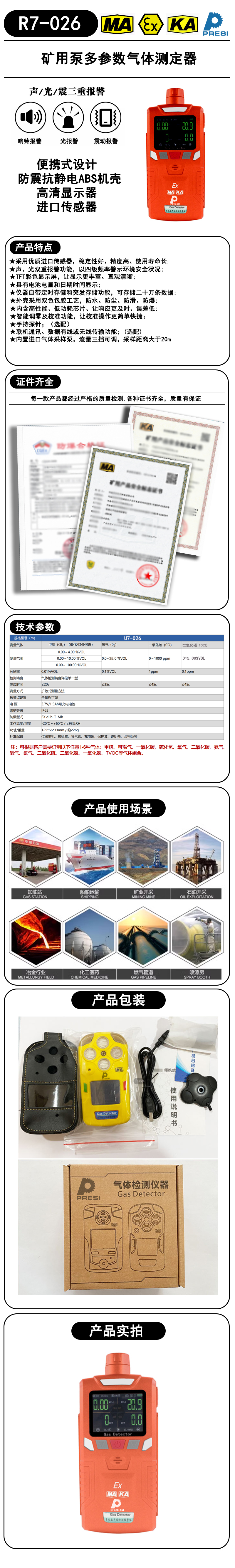 ★采用优质进口传感器,稳定性好、精度高、使用寿命长;★声、光、震三重报警功能,以四级频率警示环境安全状况;★采用TFT液晶显示屏,让显示更丰富、直观清晰;★具有电池电量和日期时间显示;★智能调零及校准功能,让校准操作更简单快捷;★外売采用工程塑料,防水、防尘、防滑、防爆;★内含高性能、低功耗芯片、让响应更及时、误差低。★仪器自带定时存储和突发存储功能,可存储二十万条数据;★内置进口气体采样泵,流量三挡可调,采样距离大于20m;★手持探针;(选配)★联机通讯、数据有限或无线传输功能;(选配)
