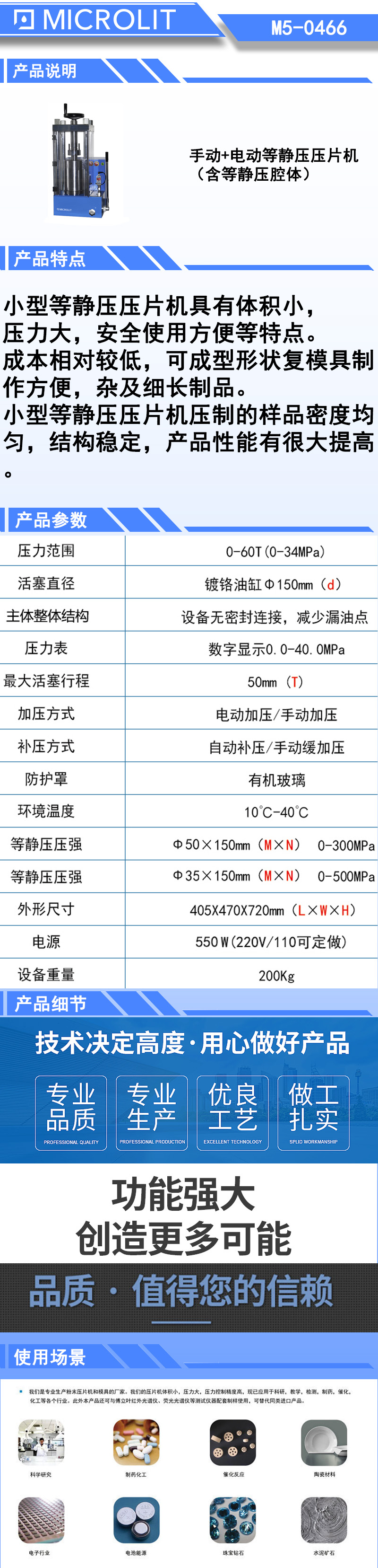 *小型等静压压片机具有体积小,压力大,安全,使用方便等特点。 *模具制作方便,成本相对较低,可成型形状复杂及细长制品。 *小型等静压压片机压制的样品密度均匀,结构稳定,产品性能有很大提高。