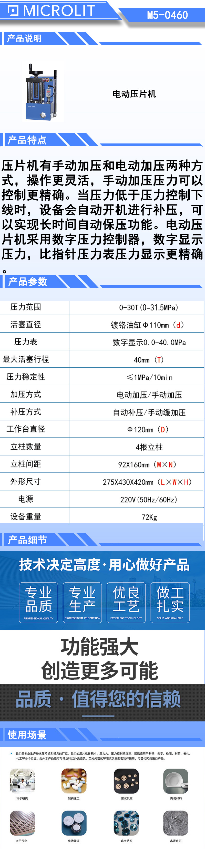 *压片机有手动加压和电动加压两种方式,操作更灵活,手动加压压力可以控制更精确。