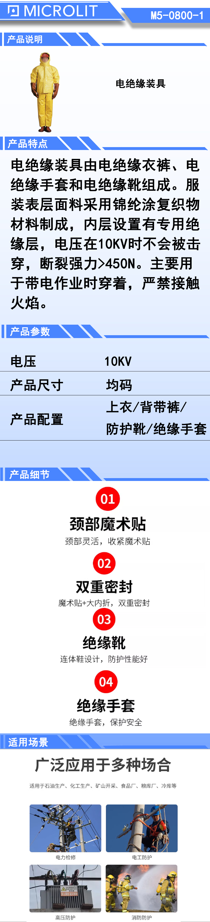 电绝缘装具由电绝缘衣销、电绝缘手套和电绝缘靴组成。服装表层面料采用锦纶涂复织物材料制成,内层设置有专用绝缘层,电压在10KV时不会被击穿 ,断裂强力>450N。主要用于带电作业时穿着,严禁接触火焰。