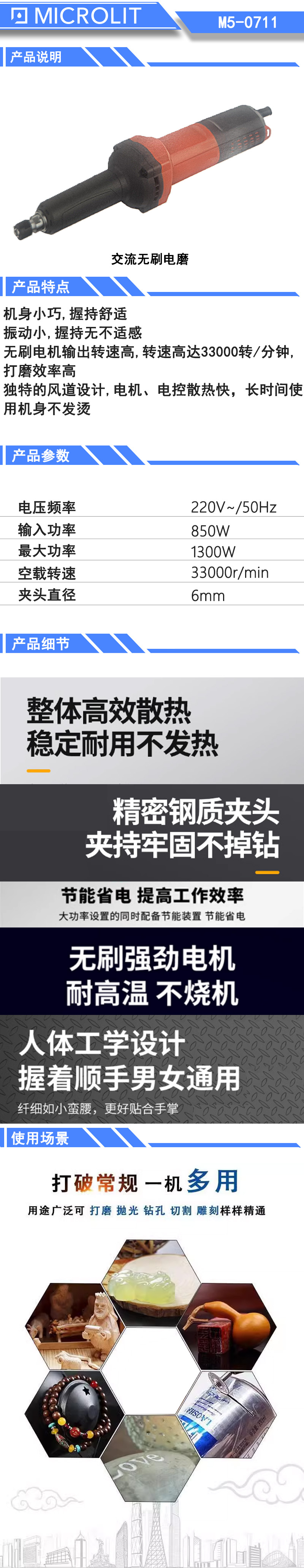 * 机身小巧,握持舒适 * 振动小,握持无不适感 * 无刷电机输出转速高,转速高达33000转/分钟,打磨效率 高 * 独特的风道设计,电机、电控散热快、长时间使用机身不发烫