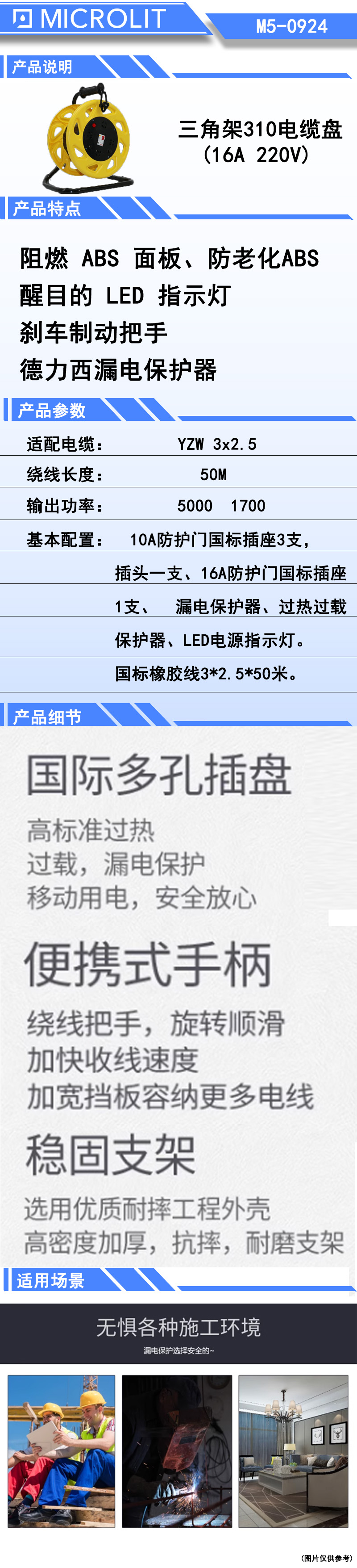 *阻燃 ABS 面板 *醒目的 LED 指示灯 *智能安全保护装置 *防紫外线抗老化材料 *橡胶制动/把手一体式装置