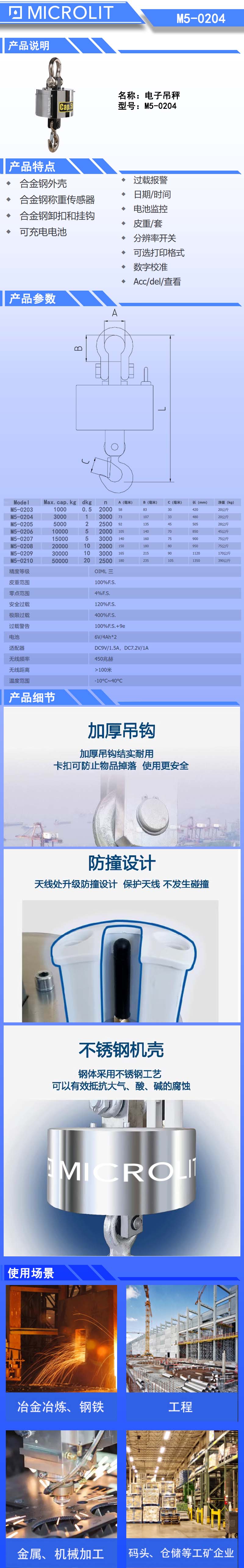 * 全钢机壳 * 美标弓型吊环、环眼吊钩 * 优质合金钢传感器 * 更换式充电电池 * 称量数据无线电传输