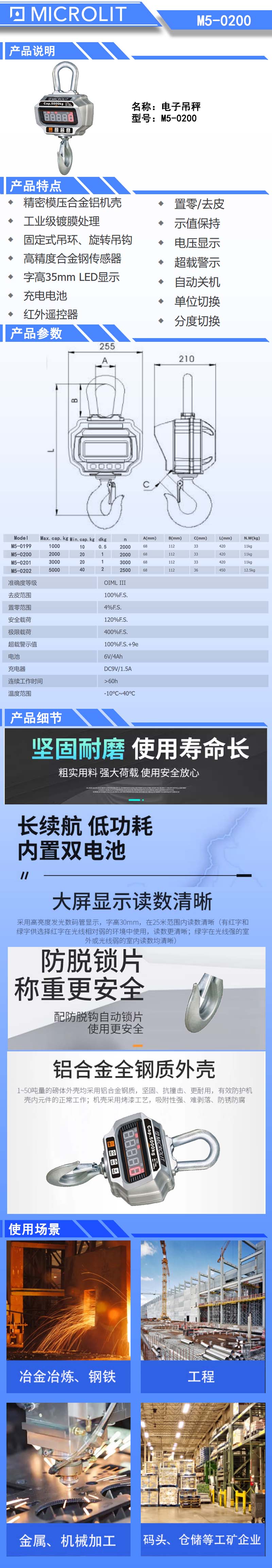 * 精密模压合金铝机壳 * 工业级镀膜处理 * 固定式吊环、旋转吊钩 * 高精度合金钢传感器 * 字高35mm LED显示 * 充电电池 * 红外遥控器