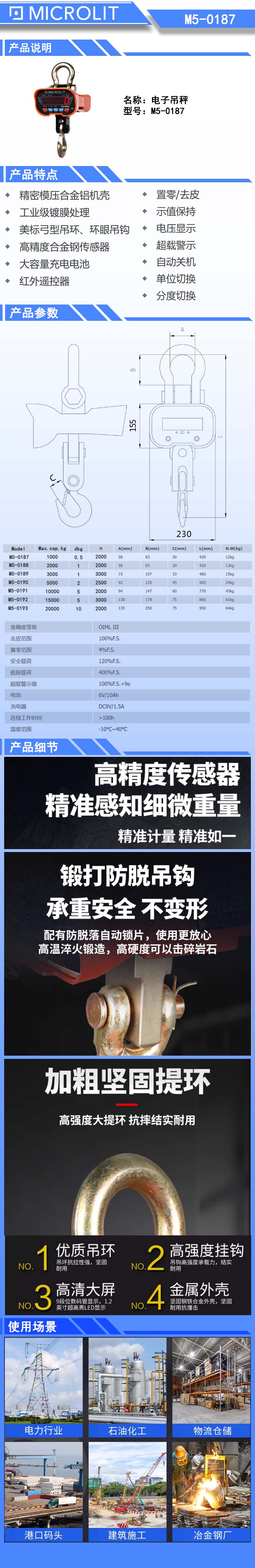 K29635 M5-0191 10000kg 5kg 2000n * 置零/去皮 * 自动关机 * 示值保持 * 单位切换 * 电压显示 * 分度切换 * 超载警示 94mm 147mm 60mm 770mm OIML Ⅲ 100%F.S. 6897.00
