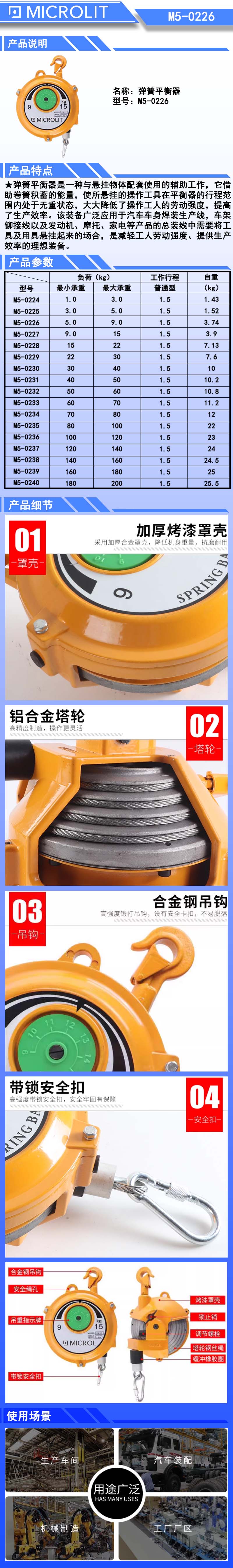 弹簧平衡器是一种与悬挂物体配套使用的辅助工作,它借助卷簧积蓄的能量,使所悬挂的操作工具在平衡器的行程范围内处于无重状态,大大降低了操作工人的劳动强度,提高了生产效率。该装备广泛应用于汽车车身焊装生产线,车架铆接线以及发动机、摩托、家电等产品的总装线中需要将工具及用具悬挂起来的场合,是减轻工人劳动强度、提供生产效率的理想装备。