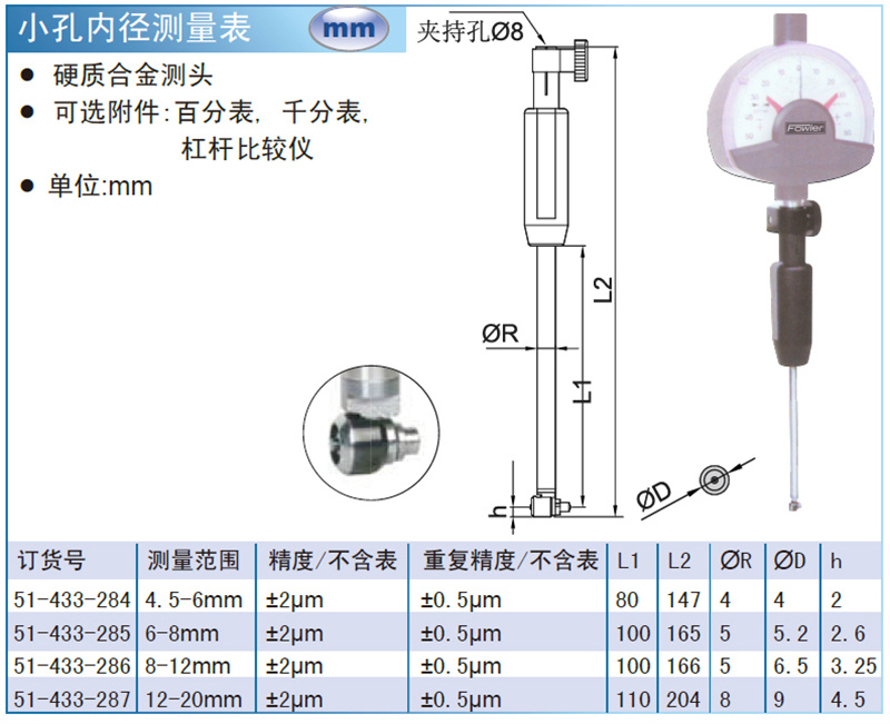·硬质合金测头 ·可选附件:百分表, 千分表, 杠杆比较仪 ·单位:mm