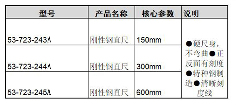 ·硬尺身,不弯曲 ·正反面有刻度 ·特种钢制造 ·清晰刻度线