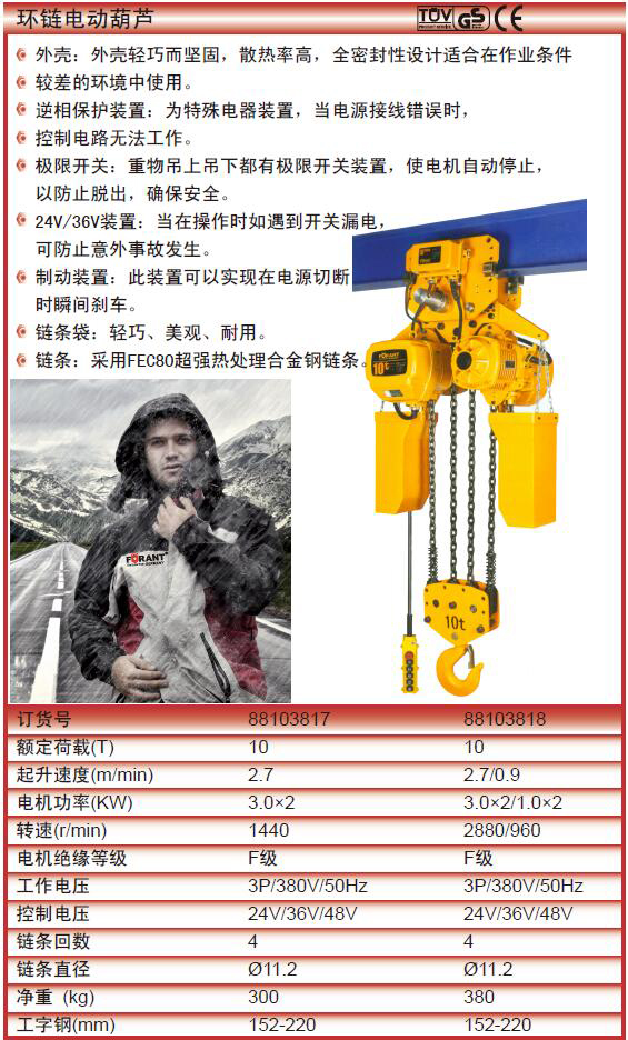 ·外壳:外壳轻巧而坚固,散热率高,全密封性设计适合在作业条件较差的环境中使用。 ·逆相保护装置:为特殊电器装置,当电源接线错误时,控制电路无法工作。 ·极限开关:重物吊上吊下都有极限开关装置,使电机自动停止,以防止脱出,确保安全。24V/36V装置:当在操作时如遇到开关漏电,可防止意外事故发生。 ·制动装置:此装置可以实现在电源切断时瞬间刹车。 ·链条袋:轻巧、美观、耐用。 ·链条:采用FEC80超强热处理合金钢链条。
