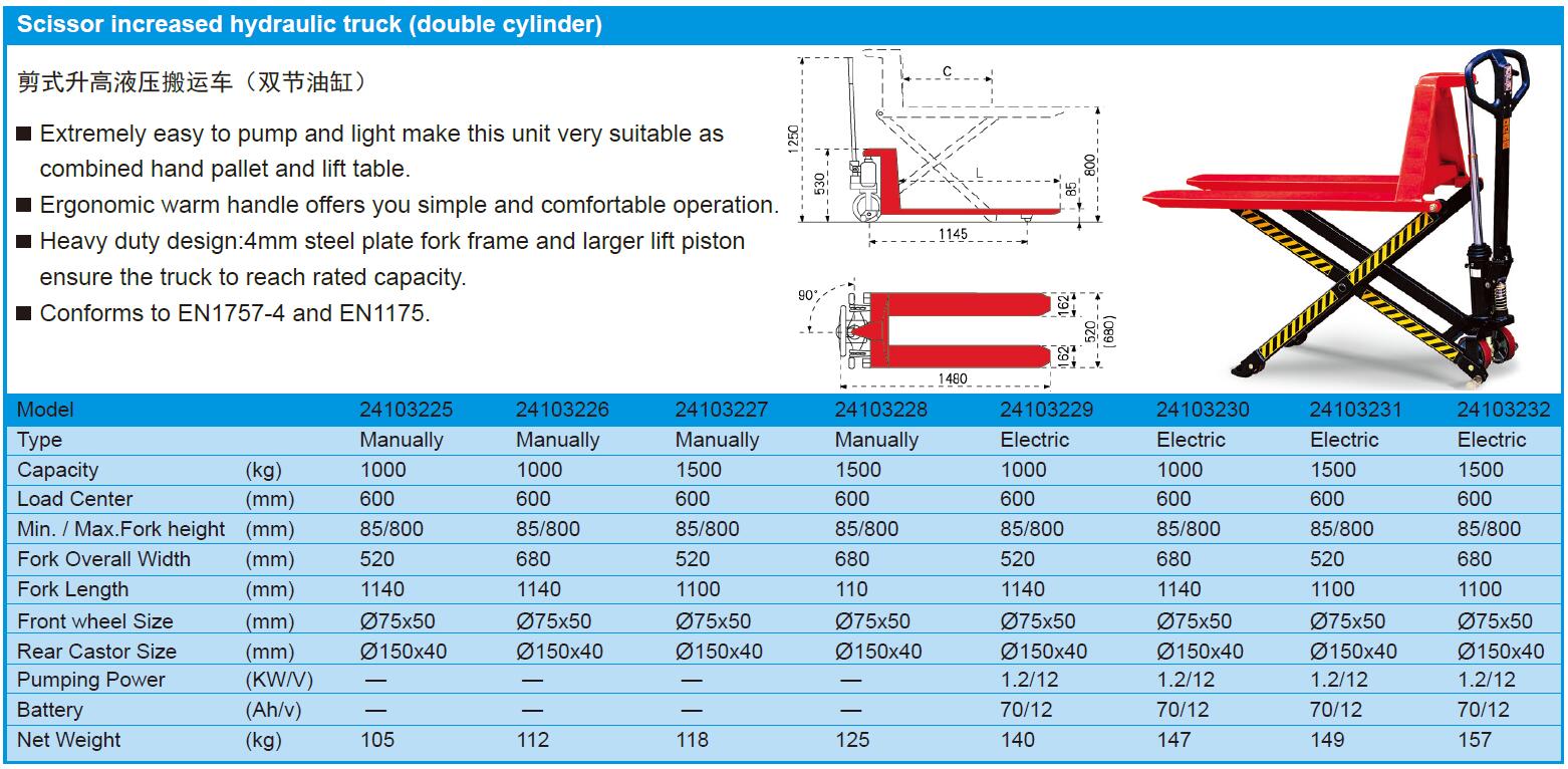 英文名称:  Scissor increased hydraulic truck (double cylinder)