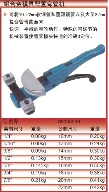 ·可将10-22mm软铜管和覆塑铜管以及大至22mm复合管弯曲至90°快速,平滑的棘轮动作,特殊的可调节的机械装置使弯管模头快速的准确3定位。