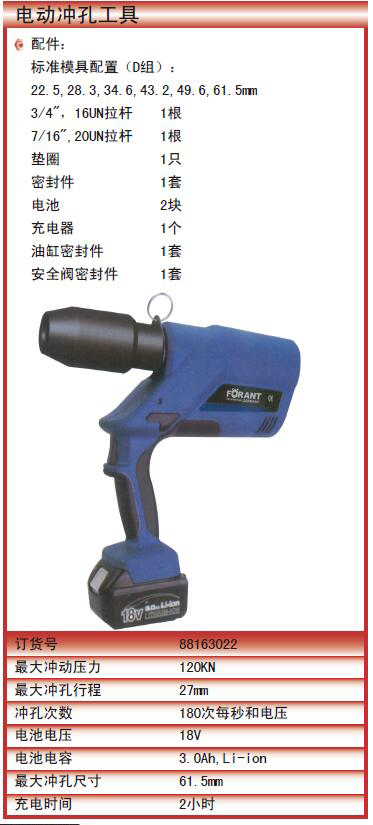 ·标准模具配置(D组):22.5,28.3,34.6,43.2,49.6,61.5mm ·3/4",16UN拉杆1根 ·7/16",20UN拉杆1根 ·垫圈1只 ·密封件1套 ·电池2块 ·充电器1个 ·油缸密封件1套 ·安全阀密封件1套