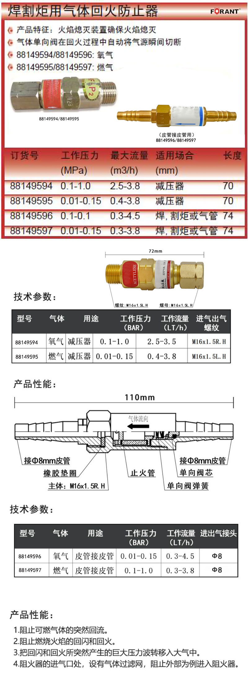 ·火焰熄灭装置确保火焰熄灭 ·气体单向阀在回火过程中自动将气源瞬间切断 ·88149594/88149596: 氧气 ·88149595/88149597: 燃气