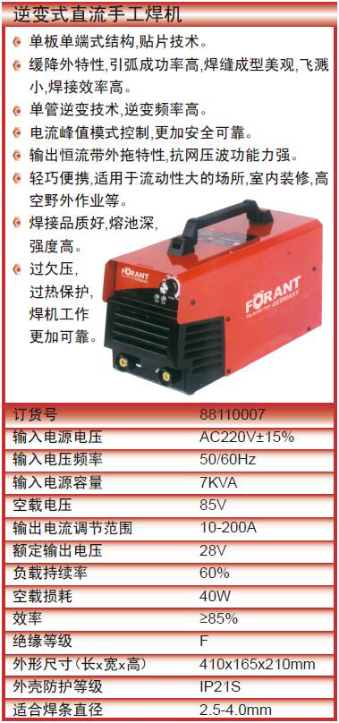 ·单板单端式结构,贴片技术。 ·缓降外特性,引弧成功率高,焊缝成型美观,飞溅小,焊接效率高。 ·单管逆变技术,逆变频率高。 ·电流峰值模式控制,更加安全可靠。 ·输出恒流带外拖特性,抗网压波功能力强。 ·轻巧便携。 ·焊接品质好,熔池深, 强度高。 ·过欠压, 过热保护, 焊机工作 更加可靠。