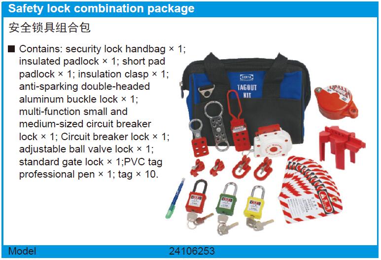安全锁手提包×1 绝缘挂锁×1 钢梁挂锁×2 绝缘扣×1 防火花双头铝扣锁×1 防火花铝扣锁×1 中小型断路器锁×2 多功能断路器锁×2 可调球阀锁×1 标准门锁×1 自动伸缩缆锁×1 PVC标签专业笔×1