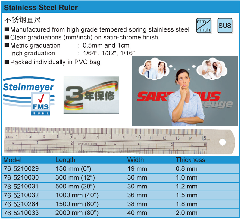 ·由高级回火弹簧不锈钢制成 ·缎面铬饰面上的透明刻度(毫米斜纹)。 ·毕业典礼:o.5mm和1cm ·公司毕业:1/64“,1/32”.1116“ ·单独包装在PVC袋中